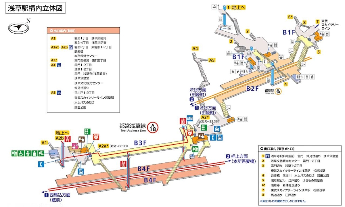なお、同駅のA1~A5出口は都営浅草線の出口、1~8番出口は東京メトロ銀座線浅草駅の出口となっていますが、浅草線と銀座線は構内でつながっています。