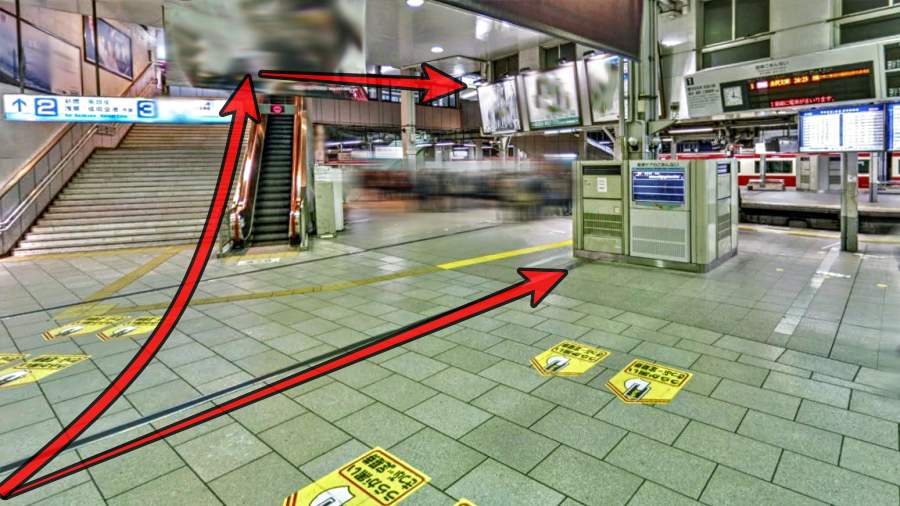 ①新幹線の3号車進行方向前側のドアから降りると、すぐそばにエスカレーターがあるので、ここから改札階へ上がります。