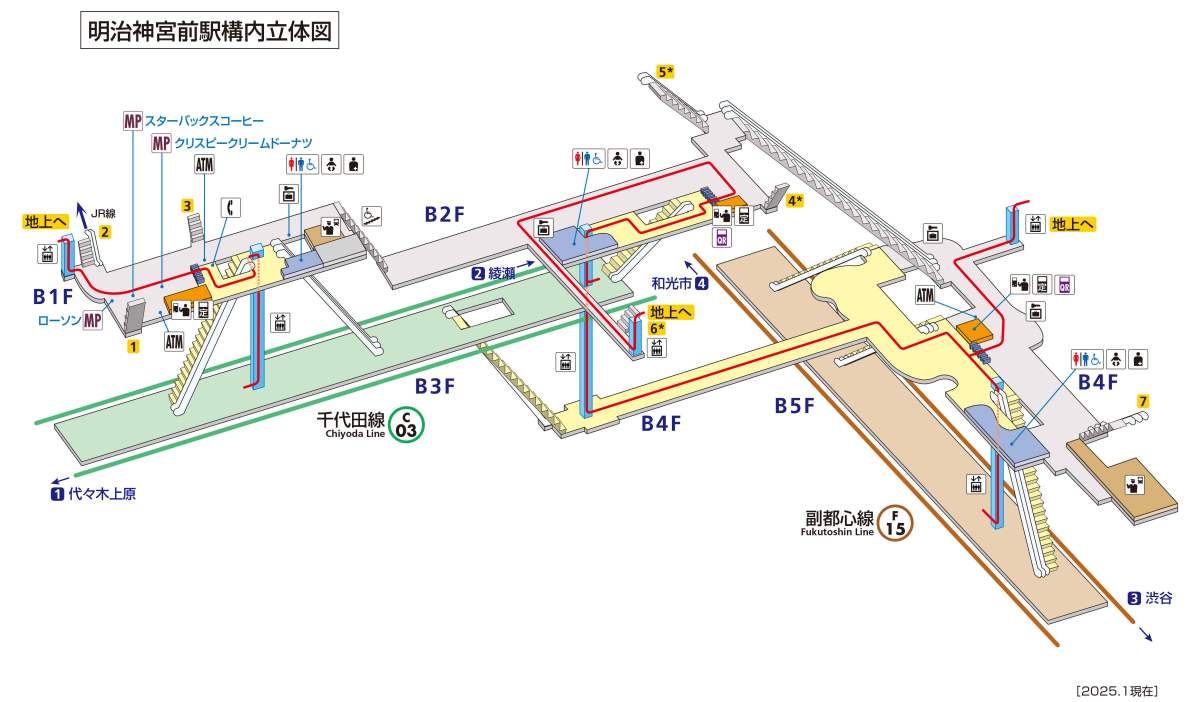東京メトロ千代田線/副都心線が乗り入れている明治神宮前駅(渋谷区)の周辺の路線図や構内図、1~7番出口の周辺風景や出口案内の情報をお送りします。