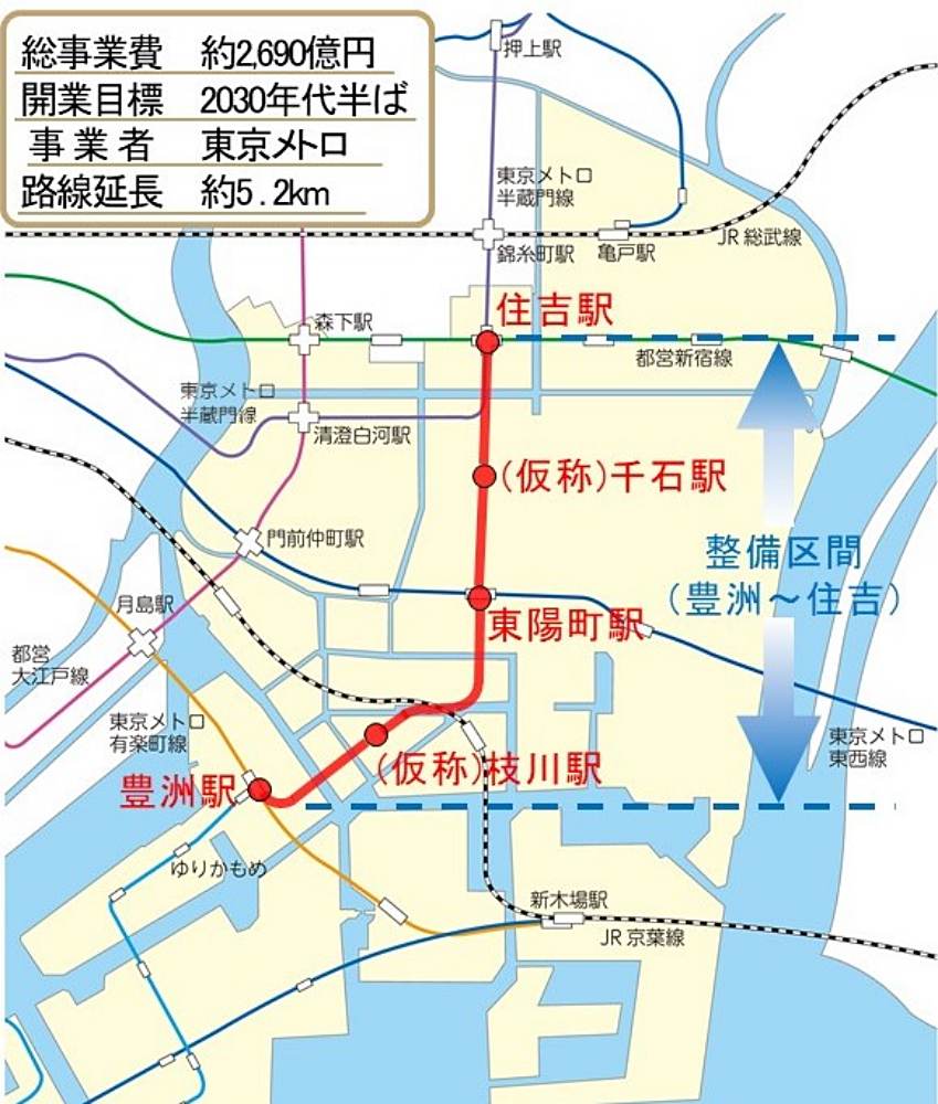 江東区は、この事業を推進するために国や東京都と協調して東京メトロへの整備費補助を行い、沿線地域のまちづくりを進めるための計画を策定しています。。
