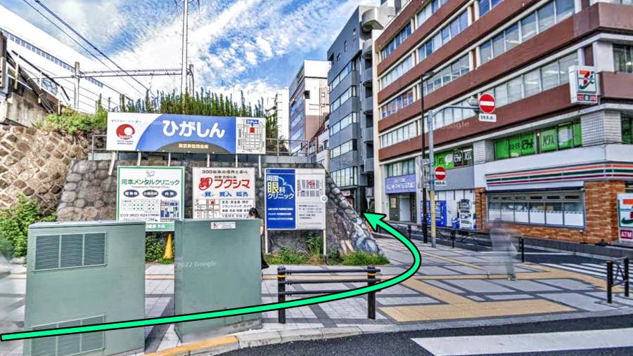 ③道なりに進む しばらく歩くと、途中にセブンイレブンが見えてきます。引き続き線路沿いを道なりに進みます。