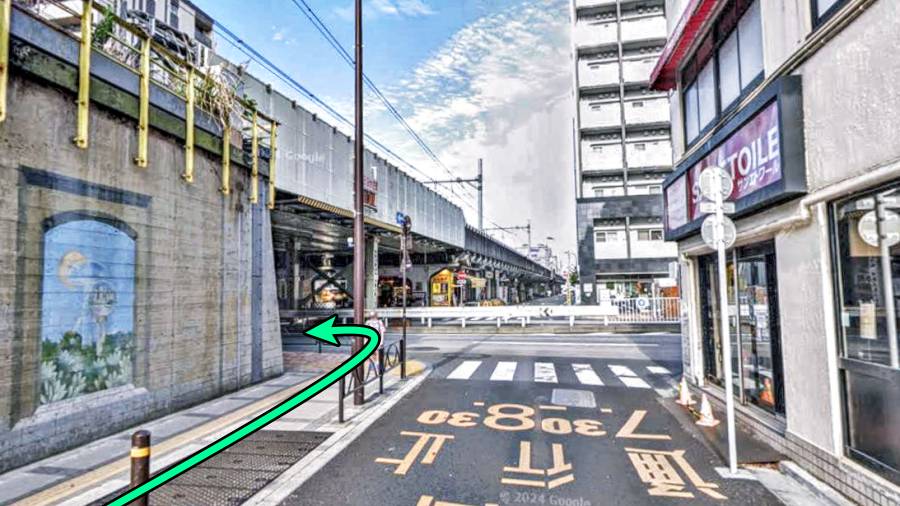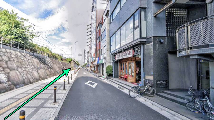 ②線路沿いを道なりに進む 左折すると、左手高架上にJRの線路が見えます。この線路に沿って、そのまま道なりに進みます。