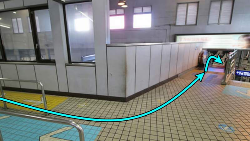 ①JR線のりかえ改札を出ると、目の前に短めの階段がありますので、これを下りて左斜め前方に行きます。