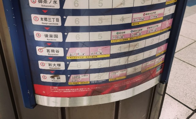 丸ノ内線の一番前の車両の6号車に乗ると、池袋駅でスムーズに東武東上線に乗り換えることができます。