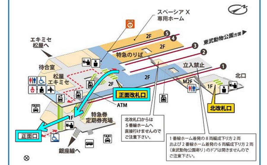 東武線の進行方向の一番前の車両に乗っておくと、正面改札口の近くで降車できます。