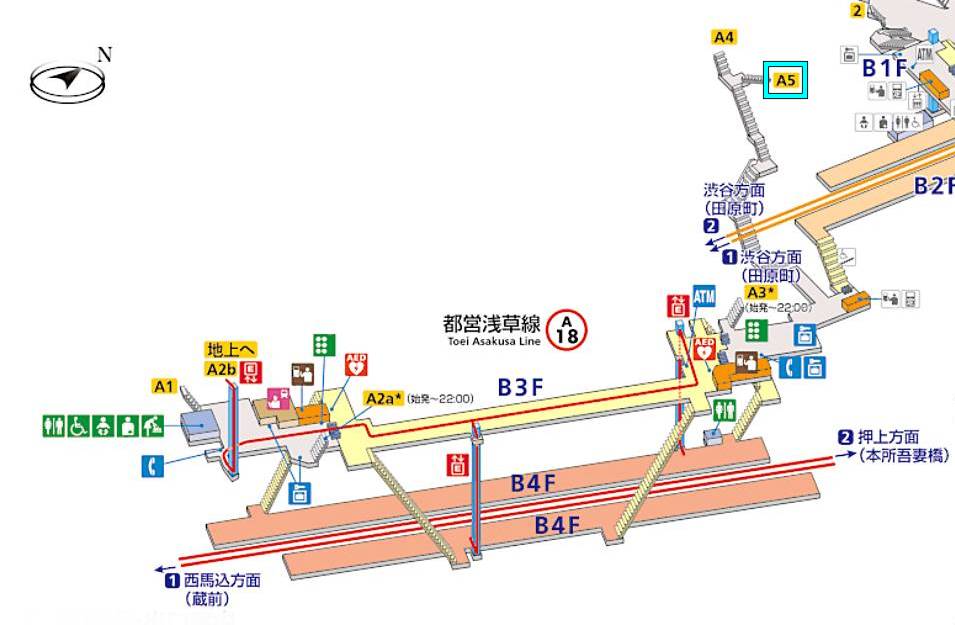 改札を通ったら、さらに階段を下りて地下4階に行くと浅草線のホームに到着です。