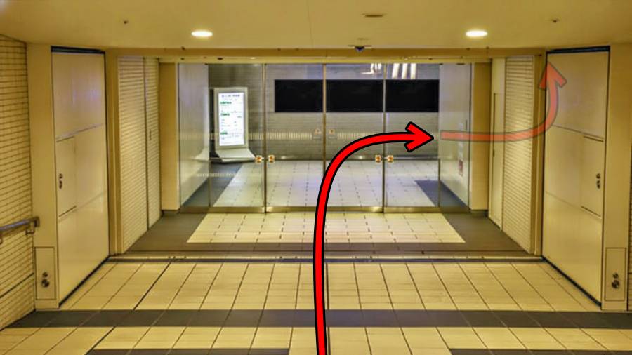 ④ここから2分弱、地下通路をひたすら直進します。そして、通路の突き当たりにある1つ目の自動ドアから中に入り、すぐ右側の通路をさらに1分弱直進します。